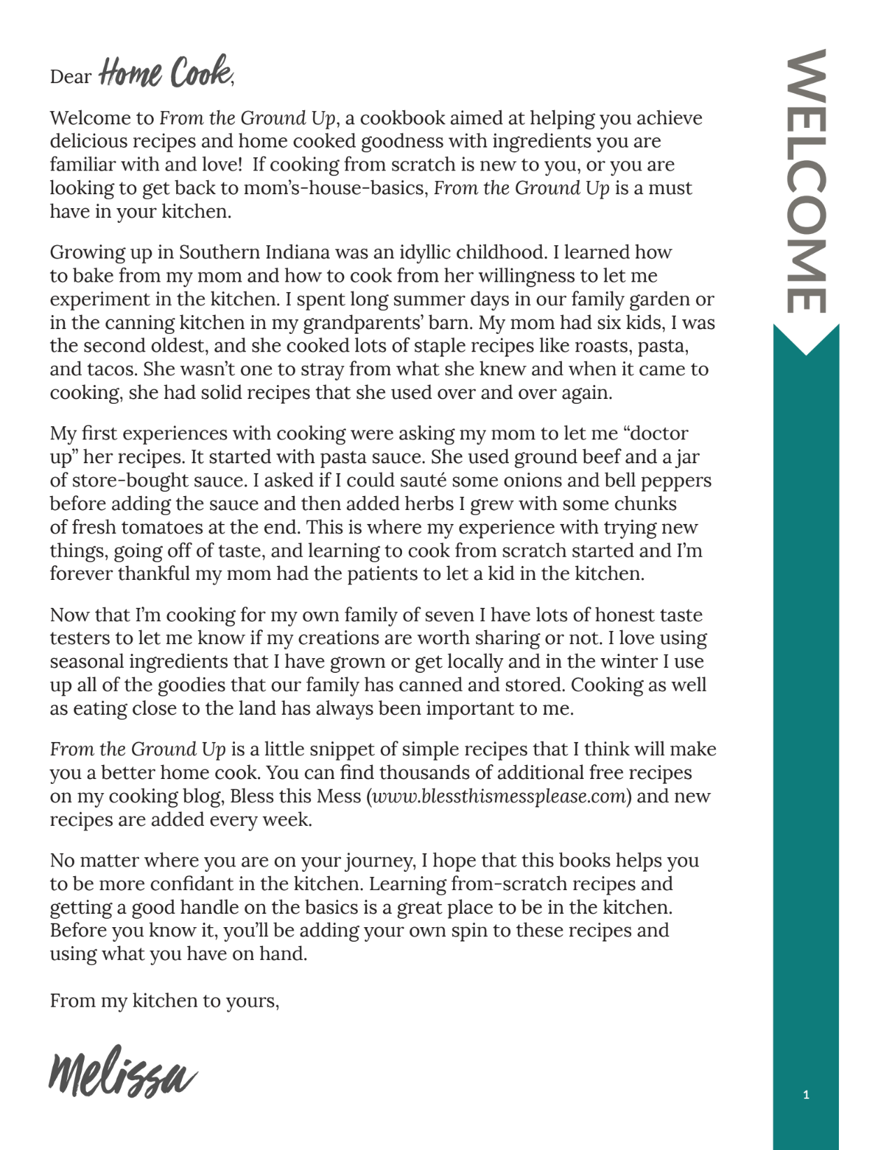 "Growing up in Southern Indiana, I learned the value of simple, honest cooking. This cookbook is more than just recipes – it's about connecting with our food, our families, and our traditions. Whether you're just starting out or returning to basics, these recipes will help you create meals that nourish both body and soul." - Melissa